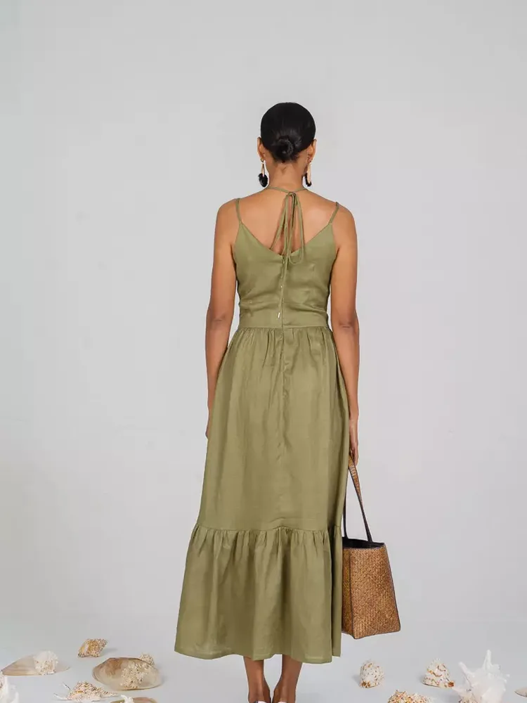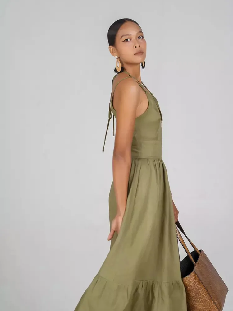 Detail Gaun Linen Kasual Wanita Deep V Neck